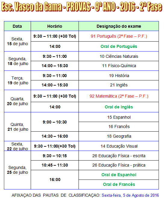 · O calendário de exames será afixado no dia 30 de janeiro.